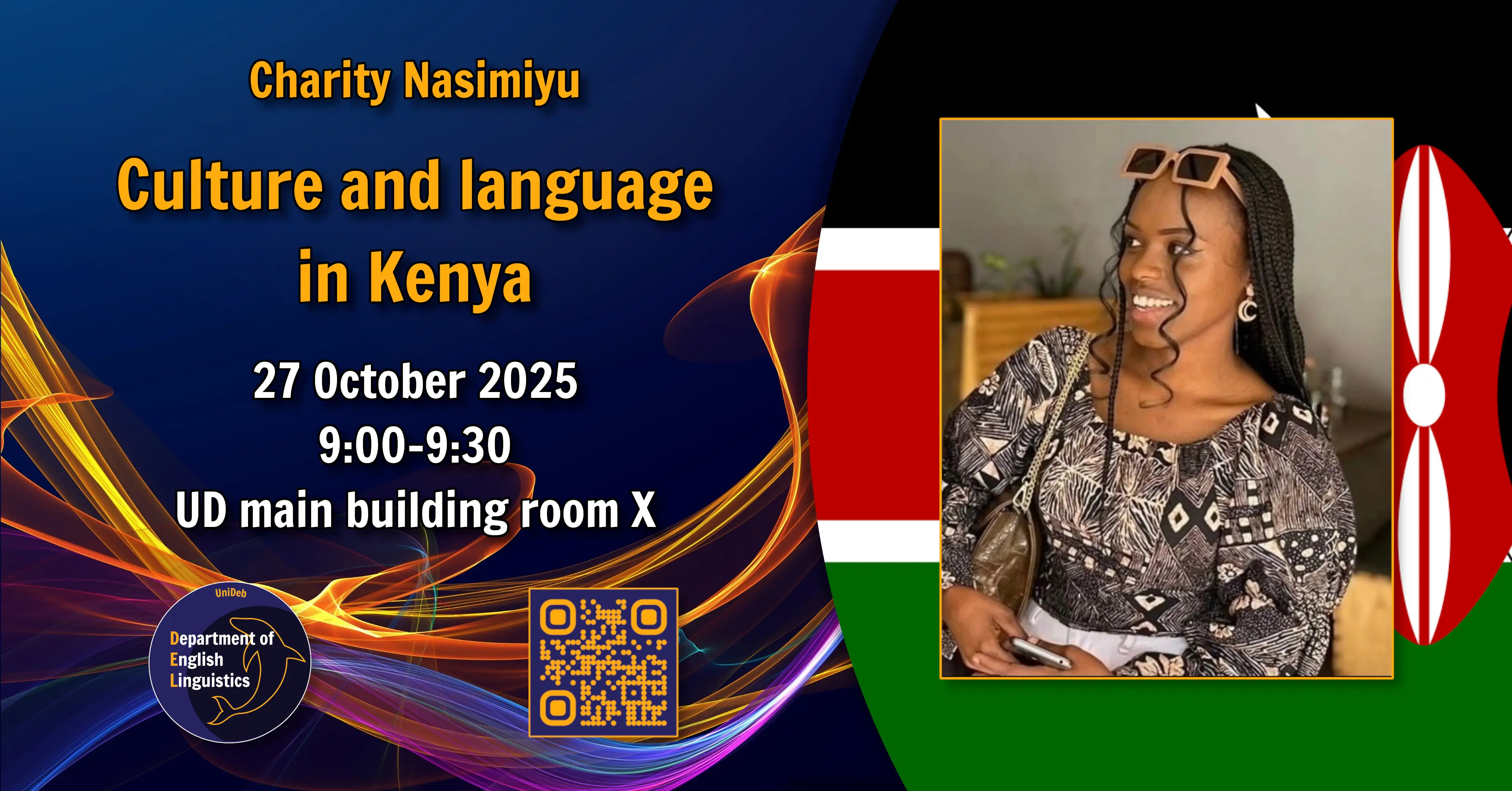Charity Nasimiyu, a UD student from Kenya is giving a presentation about the country's culture and linguistic landscape, as part of UD professor emeritus Lászó Hunyadi's lecture course "Bevezetés a nyelvtudományba" (Introduction to the science of language).