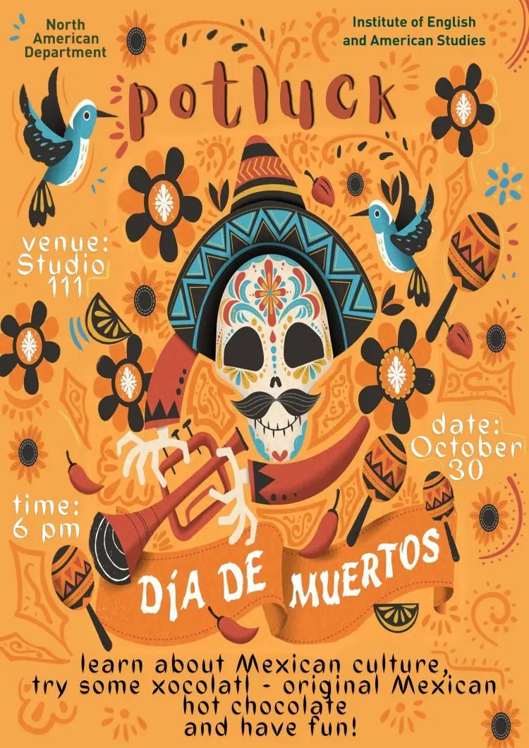 The North American Department cordially invites all students and faculty of the Institute of English and American Studies to the Mexican Day of the Dead celebration and potluck. Find out more about the cultural background of this unique festival from Agustín Cadena, try some original Mexican hot chocolate, and have fun! You are also welcome to contribute to the event with snacks or drinks.